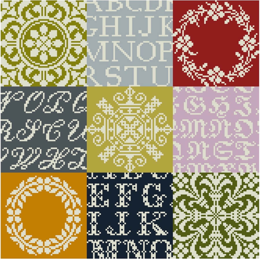 Unser Farbenpotpourri kommt frisch und modern daher, obwohl sich auch hier historische Muster finden. Neben vier Alphabeten, und zwei schlichten Kränzchen stehen flächenfüllende Muster auf buntem Untergrund, der natürlich auch gestickt ist! Die Alphabete sind nicht vollständig und zum Teil sogar angeschnitten, was dem Muster einen modernen Touch verleiht.