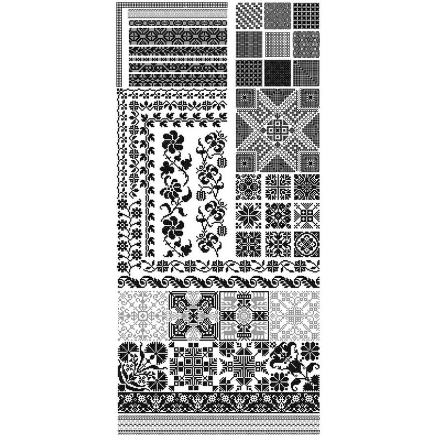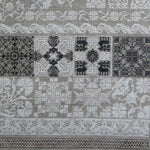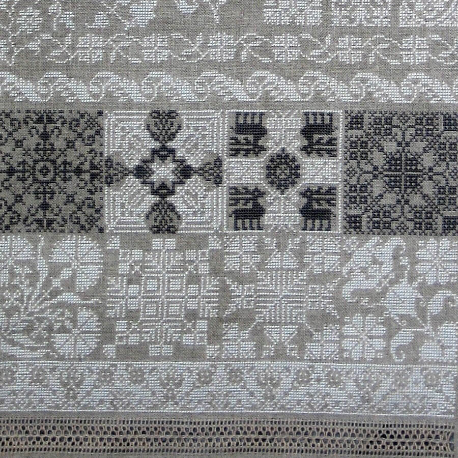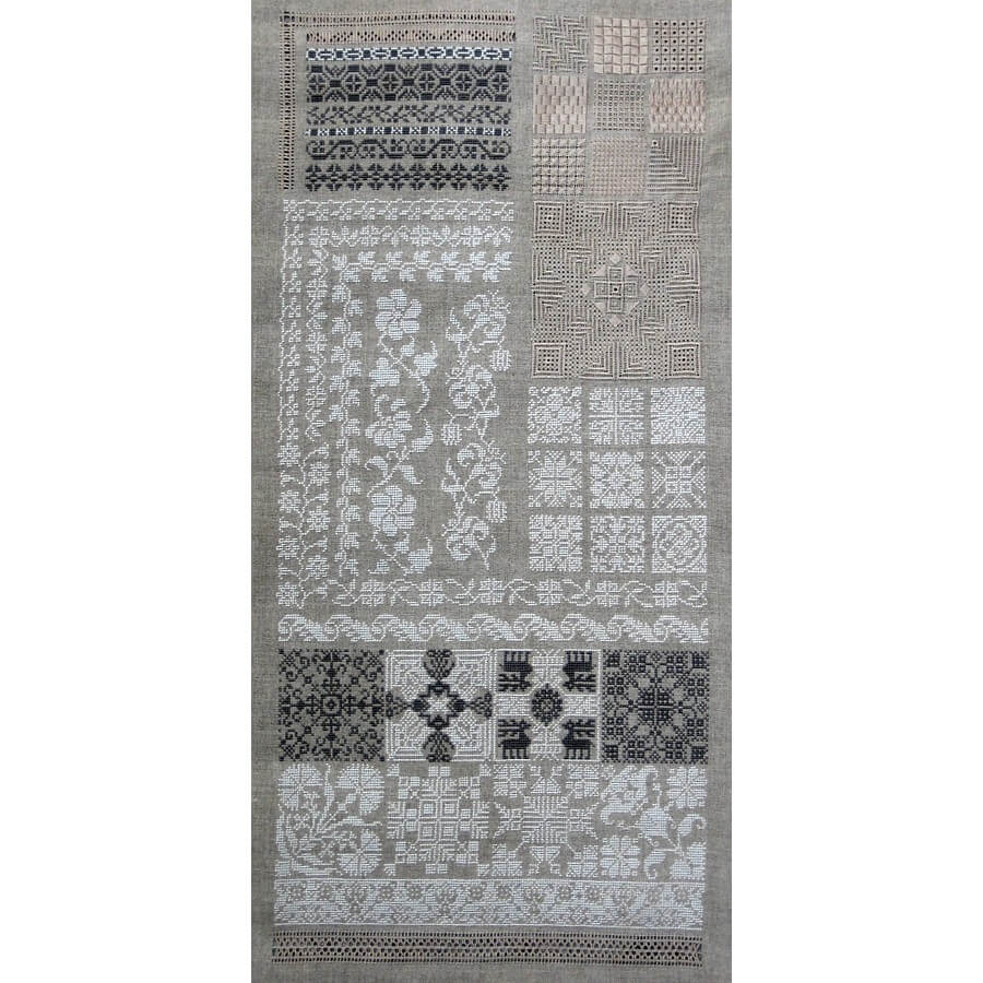 Hier sind die Kreuzstichmotive kombiniert mit verschiedenen Hohlsäumen, Ajourmustern, Plattstichen und Spannstichen. Dieses Stickmustertuch ist eher für erfahrene StickerInnen zu empfehlen.