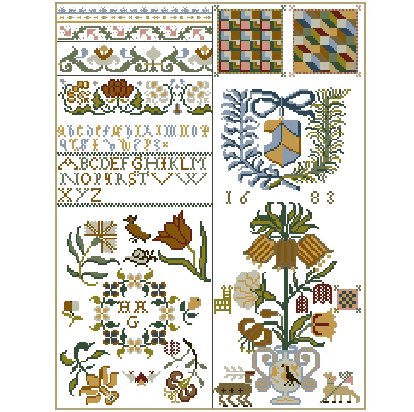 Dieses Stickmustertuch befindet sich im Besitz des Bayerischen Nationalmuseums in München. Das Tuch zeigt das Wappen und das Monogramm HAG der Familie Gruber. Typisch für die Nürnberger Mustertücher ist der sogenannte Blumenbarock. Auch in diesem Tuch spielen Blumen eine zentrale Rolle. Auch nach so vielen Jahrhunderten wirken die Muster immer noch frisch und fröhlich.