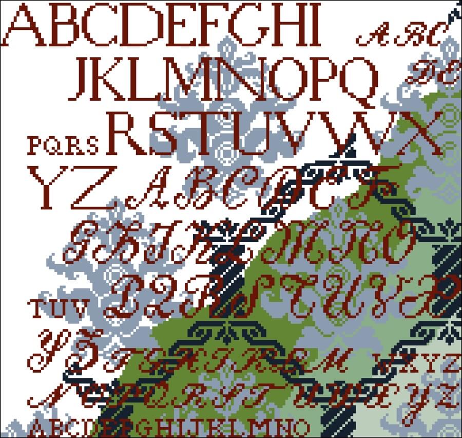 Dieser klassische Sampler ist etwas ganz Besonderes. Er wirkt wie ein alter barocker, etwas verschlissener Stoff, auf den verschiedene historische Alphabete gestickt sind! Ein muster für Kreuzstich-Enthusiasten und solche, die es werden wollen.