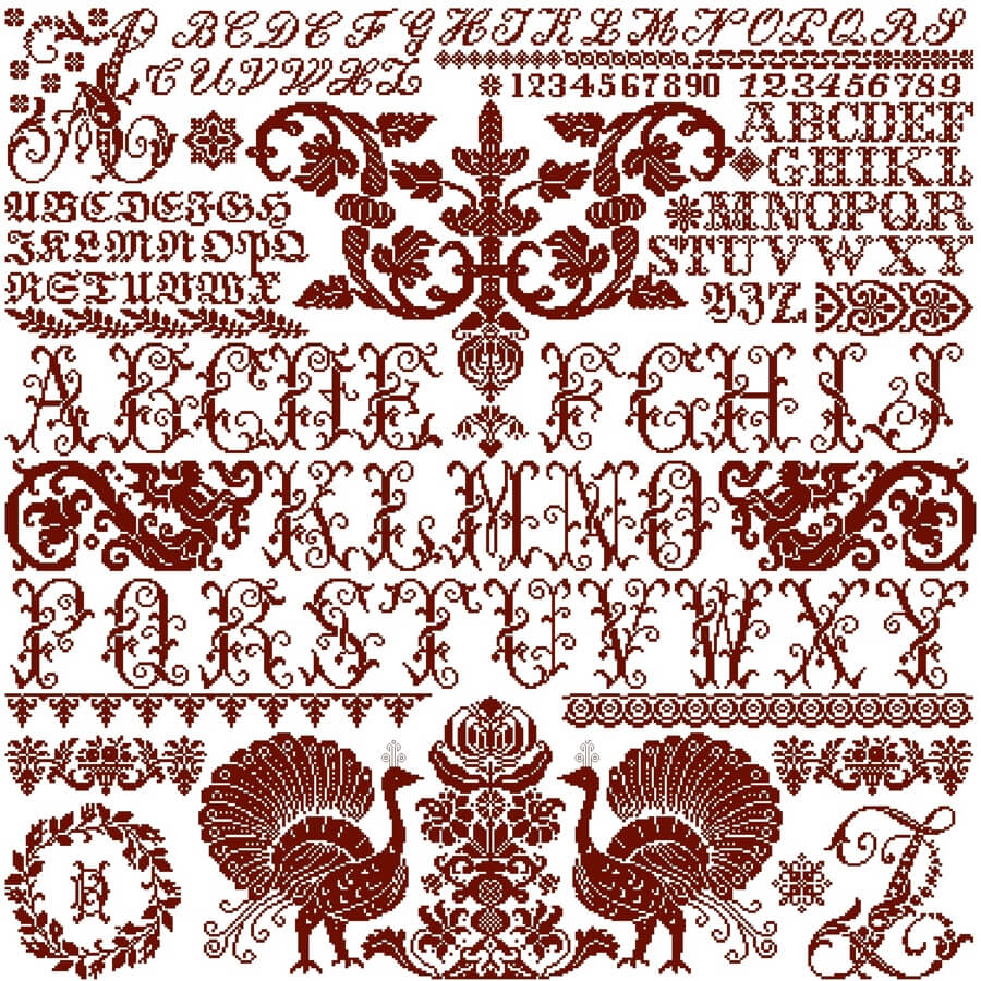 Dieses Tuch ist eine wahre Fundgrube von Mustern und Alphabeten, die man natürlich auch für viele andere Zwecke nutzen kann. Stickspaß ohne Ende!
