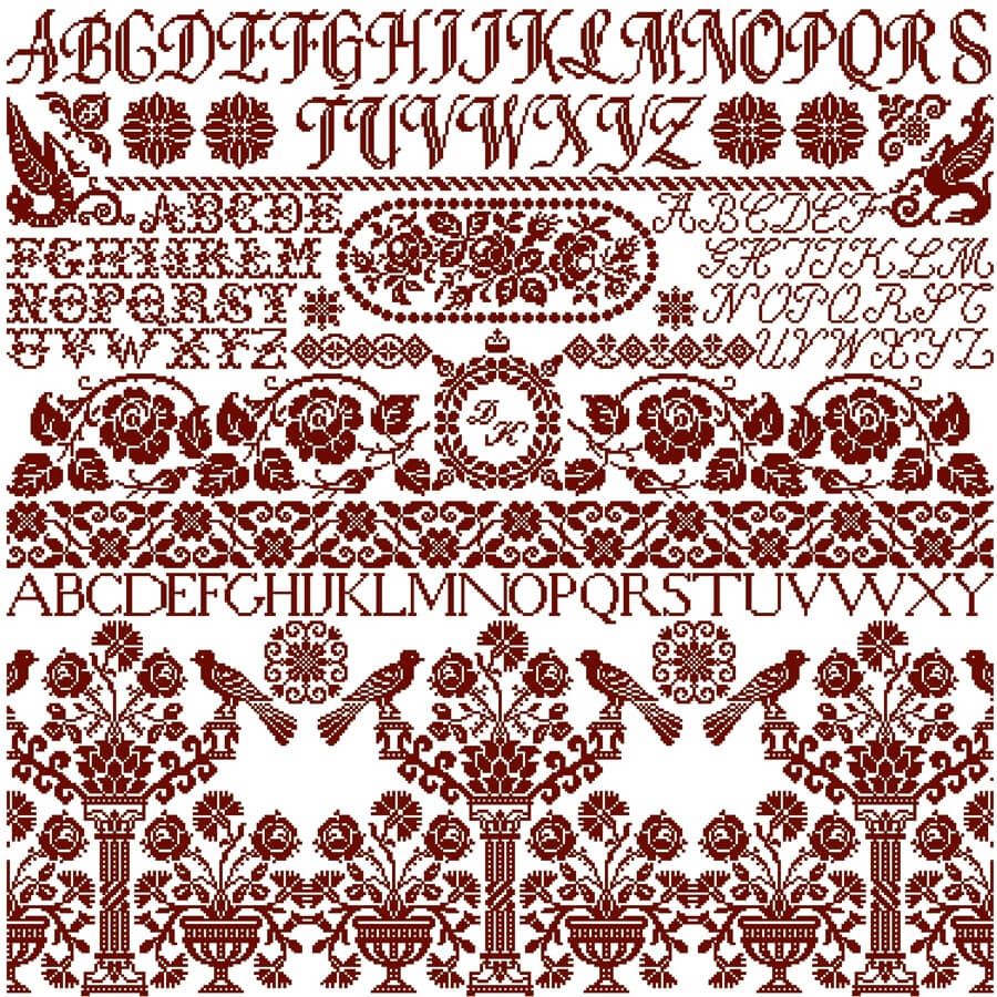 Dieses Tuch ist eine wahre Fundgrube von Mustern und Alphabeten, die man natürlich auch für viele andere Zwecke nutzen kann. Stickspaß ohne Ende!