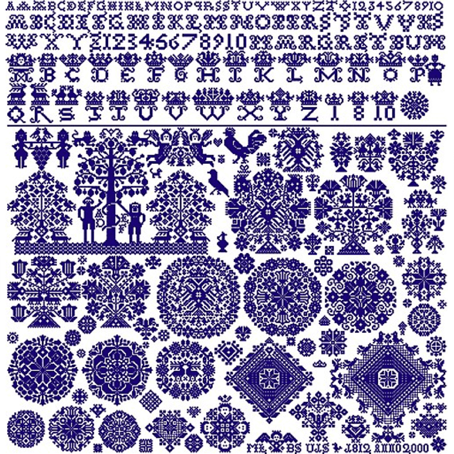 Anhand eines Fotos aus dem Buch von Eva Maria Leszner haben wir das alte Stickmustertuch Stich für Stich rekonstruiert und als Stickvorlage aufgearbeitet.*)