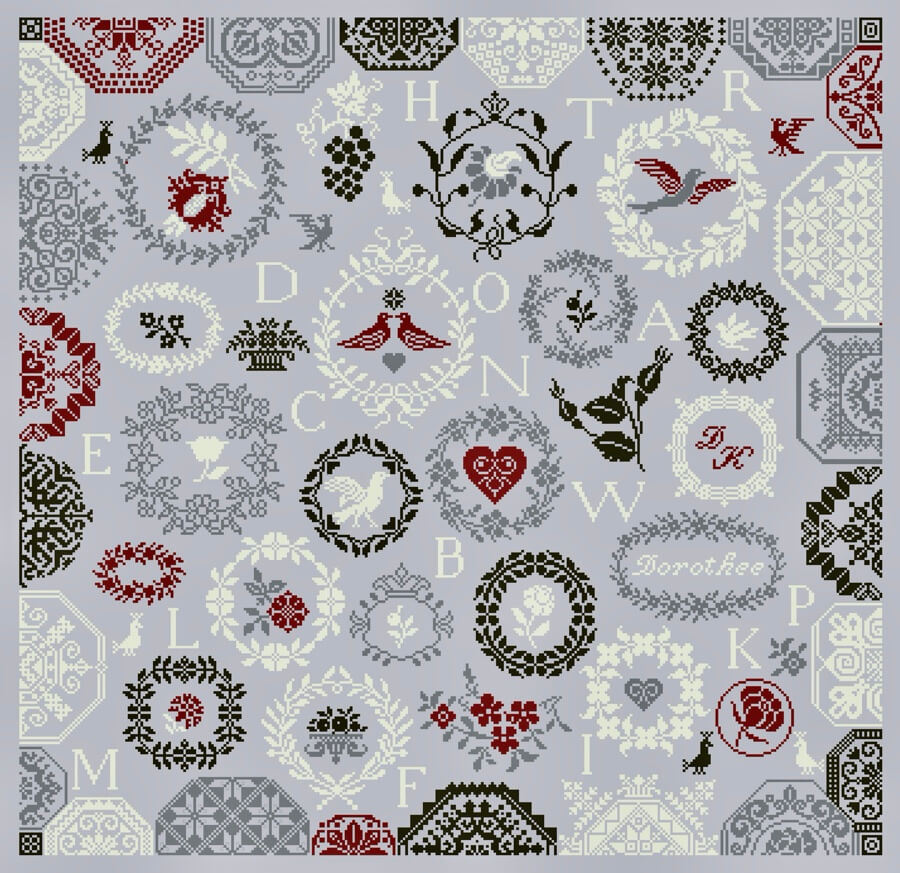 Ein etwas anderer Quaker Sampler. In der Mitte finden sich nicht die typischen Oktogons der Ackworth Sampler, sondern viele kleine florale Motive in Kartuschen und Kränzchen. Auf edlem grauen Leinen gestickt, entsteht etwas ganz Besonderes. Jedes einzelne Kränzchen, mit den eigenen Initialen versehen, eignet sich auch dazu, einzeln gestickt zu werden und Tischwäsche und Servietten zu verzieren.