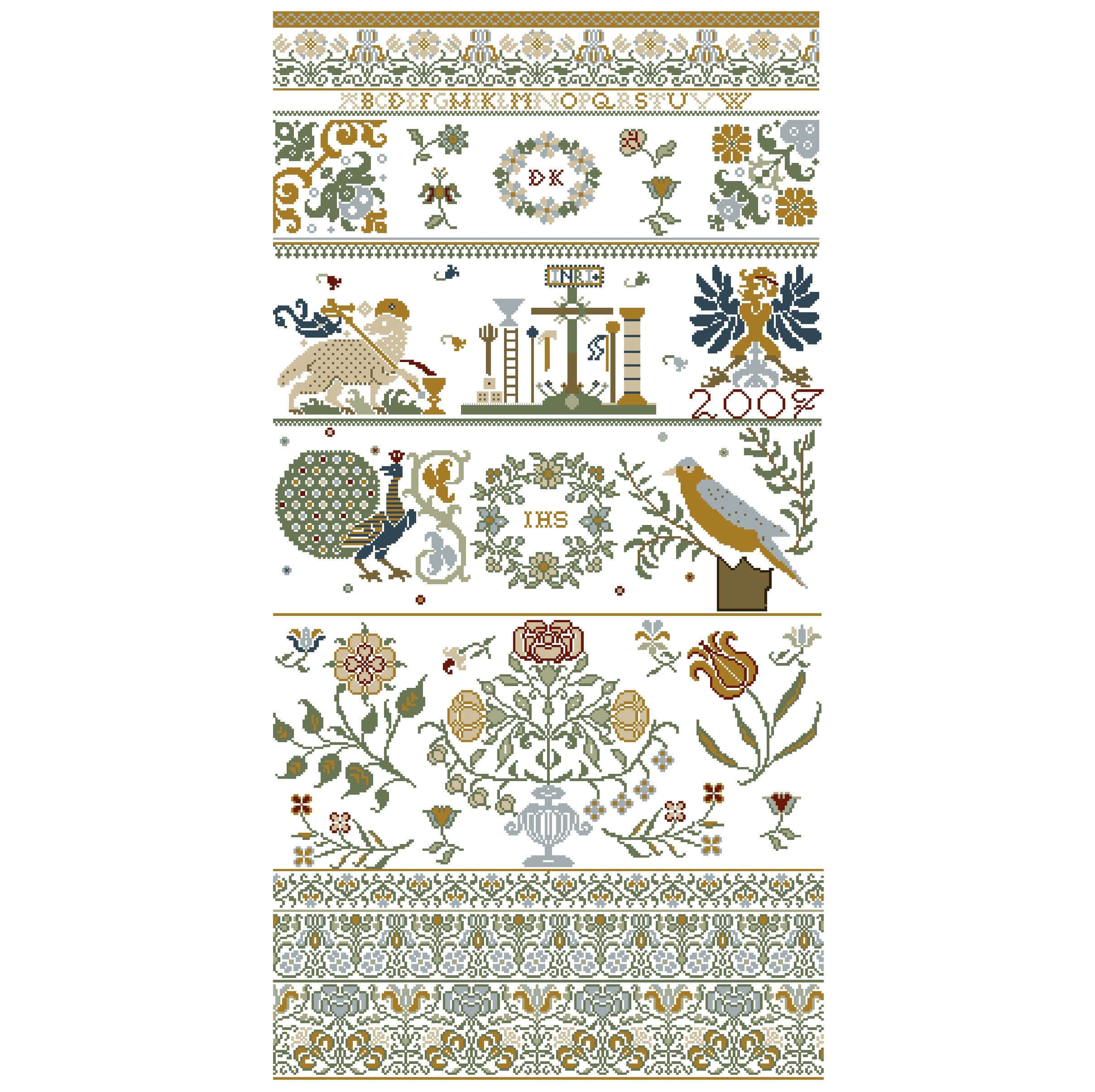 Dieses Tuch versammelt alle Motive, die im Barock aufkamen, das Sibmacher Lamm und den Sibmacher Pfau. Die feinen Muster und die Blütenpracht repräsentieren bereits die Verfeinerung des Barock im Rokoko.