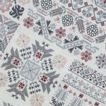 Das Tuch enthält 7 Farbtöne, 3 in Grauschattierungen, 4 in Rosa- und Rottönen.
