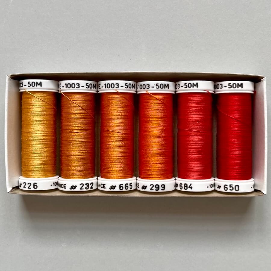Im Pack 6 Nuances Soie 1003 Orange finden sich 6 Spulen in feiner Farbabschattierung. Jede Spule enthält 50 Meter Garn.