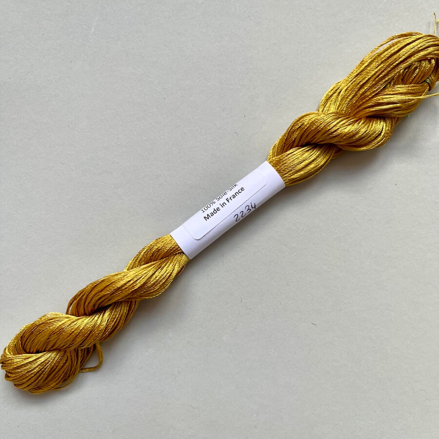Soie de Paris 2234 ist eine der beliebtesten Farben, die Seide gleitet durch den Stoff wie flüssiges Gold. Gerade in der Weihnachtszeit kommt Soie de Paris 2234 zum Einsatz, um Highlights mit Gold zu setzen. Mit Soie de Paris läßt sich viel einfacher sticken, als wenn man zu Metallic Garn greifen würde, also eine echte und sehr edle Alternative zu Metallic Garn in Gold.