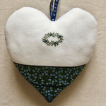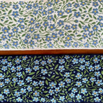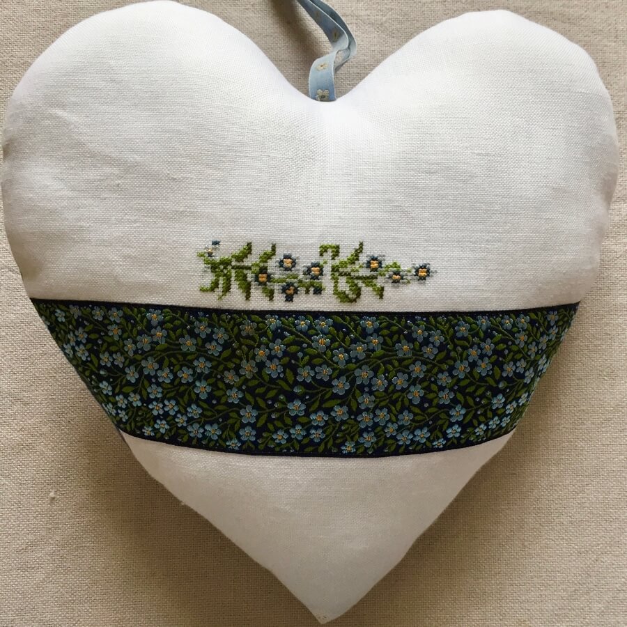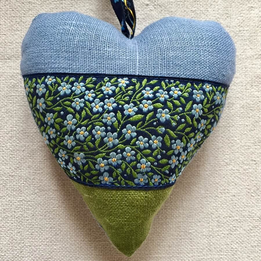 Unser Favorit: Das Vergissmeinnichtband der Bandweberei C. Pauli-Kafka. Das Muster hat auf Grund seiner Schönheit und Ausgewogenheit immer noch Bestand: ein Klassiker. Das Band hat eine Breite von 50 mm und wirkt auch ganz unverarbeitet als Tischband auf einer weißen Tischdecke sehr edel. Wir haben es zu Herzen verarbeitet, ein Hingucker. Diese Borte lässt auch die verarbeiteten Stoffe, das weiße Leinen oder das blaue und grüne Nähleinen in schönstem Licht erscheinen. Die Vergissmeinnichtwiese läutet den Frühling ein.