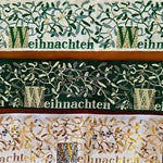 Die Bandweberei Kafka webt auf alten Jacquard-Webstühlen aus dem 19.ten Jahrhundert Bänder in alter Tradition in unübertroffener Qualität. Ein Klassiker sind die Weihnachtswebbänder, die zur Verzierung von Kissen, in Kombination mit Kreuzstichmustern, als Tischbänder in der Weihnachtszeit oder in Passepartoutkarten verwendet werden können. Der Phantasie sind keine Grenzen gesetzt. Was ist weihnachtlicher als gewebte Mistelzweige?