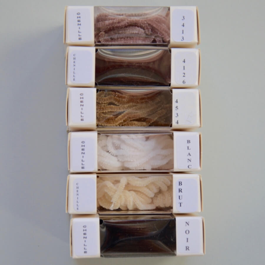 Chenille de Soie ist ein samtartiger Faden mit seitlich abstehenden Haaren. Dieser sogenannte Flor gibt dem Chenillegarn das Aussehen einer Raupe. Das Innere des Garns besteht aus zwei reißfesten Seidenfäden, die während der Herstellung verzwirnt werden. Während der Verzwirnung fallen kleine, fein geschnittene Seidenfäden zwischen die beiden inneren Fäden und werden von ihnen zusammengehalten. Im 18. Jahrhundert hat man Chenillefäden häufig zum Sticken benutzt, etwa um den Rand eines Mustertuchs einzufassen oder bei der Nadelmalerei naturnahe Elemente zu gestalten wie eine Wiese oder Baumkronen. Chenille eignet sich zum Sticken und für Applikationen. Chenille ist in 21 Farben verfügbar. Das Garn wird in kleinen Boxen zu jeweils 5 Metern geliefert. Die Farben korrespondieren mit den Farben von Soie d´Alger, Soie Ovale, Soie de Paris, Soie Gobelins und den Seidenbändchen.