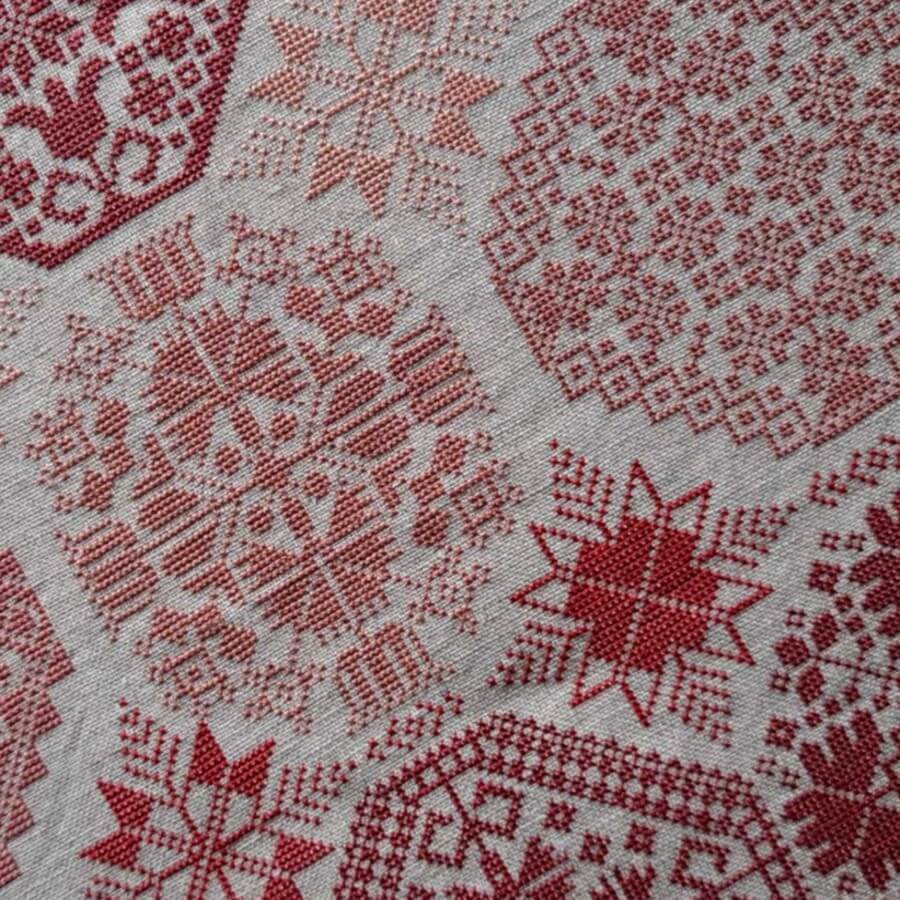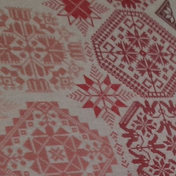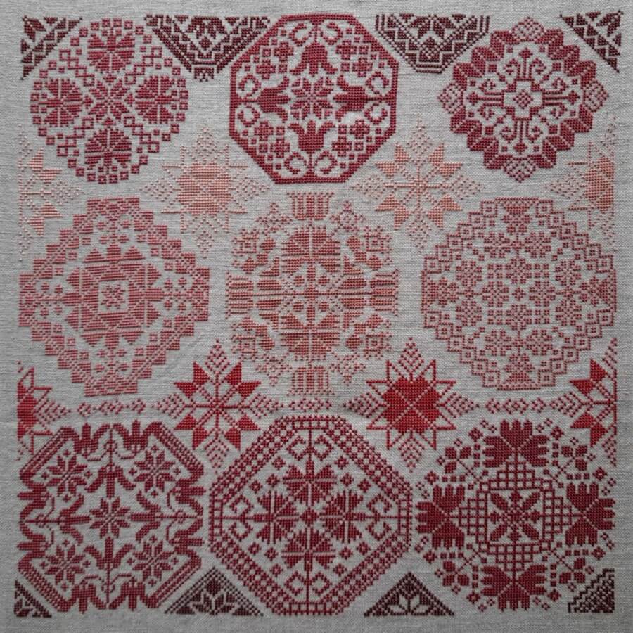 Ein zauberhaftes Quakertuch in Rot- und Rosatönen. Den Reiz dieses Mustertuchs macht die Leichtigkeit der zarten Farben in Kontrast zu den geometrischen Motiven der Quaker aus.
