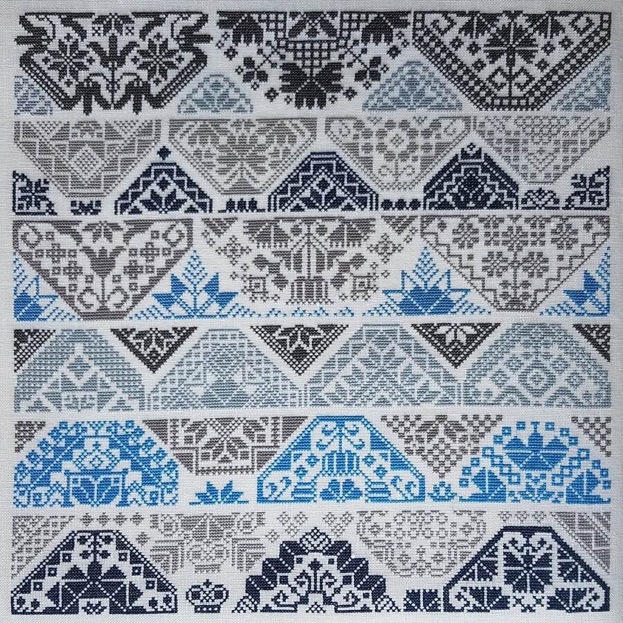 Inspiriert durch die Quakertücher aus der Ackworth-School finden Sie hier ein Mustertuch, auf dem die historischen Halbmedaillons grafisch in Reihen angeordnet sind - so wirkt es zeitlos und modern. Es wird gestickt mit Soie d’Alger in 6 Grau- und Blautönen auf weißem 14er Leinen. Das Mustertuch ist nicht nur als gerahmtes Bild ein Hingucker, sondern z.B. auch als Kissenplatte.