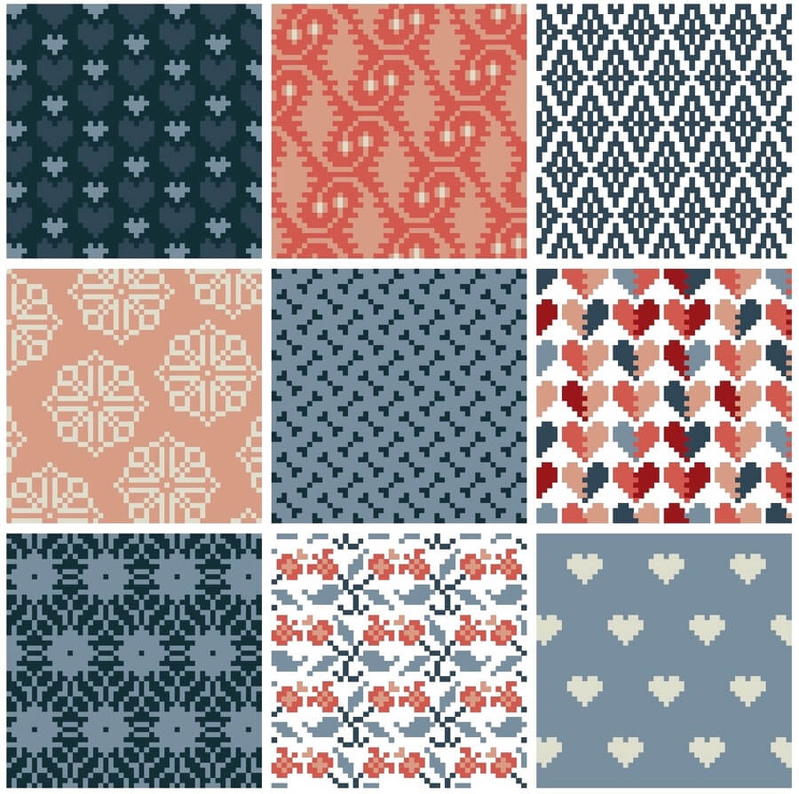 Die neun Farbflächen des Retromusters sind mit Motiven der 50er und 60er Jahre gestaltet. Auch diese Muster können - in den richtigen Farben gestickt - modern und sommerfrisch daherkommen.