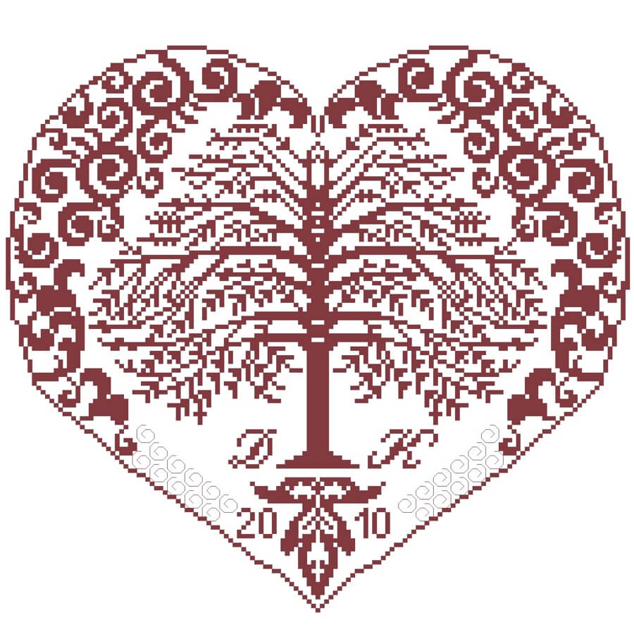 Dieses Muster stammt aus der Region des Alpenraumes und wurde traditionell auf Decken gestickt. Das Muster ist überwiegend im Kreuzstich gestickt, hinzu kommen einige Holbeinstiche, die den Ranken rund um den Baum eine gewisse Leichtigkeit geben.