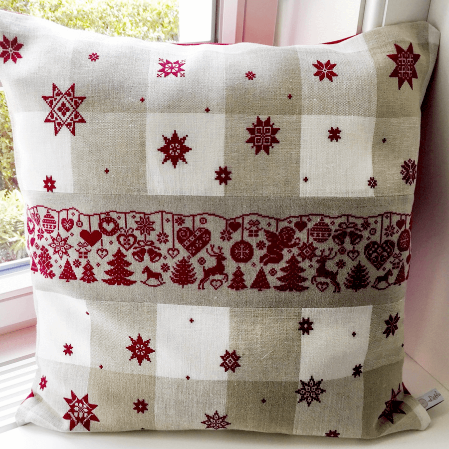 Es weihnachtet: Verbreiten Sie Gemütlichkeit und Weihnachtsstimmung mit diesem schönen Stickmuster in roter Seide auf kariertem Leinen.