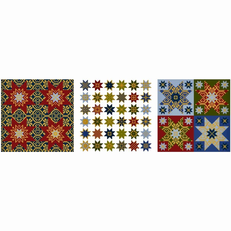 Wer es Weihnachten opulent liebt, liegt mit diesem Stickmuster richtig. Sterne auf einem barock anmutenden Goldgewebe geben dem Tuch den besonderen weihnachtlichen Glanz. In reiner Seide gestickt wirkt es besonders wertvoll und farbenfroh. Man kann alle drei Muster gemeinsam in einem Passepartout rahmen lassen oder auch Einzelrahmung wählen, der Stoffzuschnitt reicht für beide Varianten. Wir wünschen Ihnen eine schöne Vorweihnachtszeit!