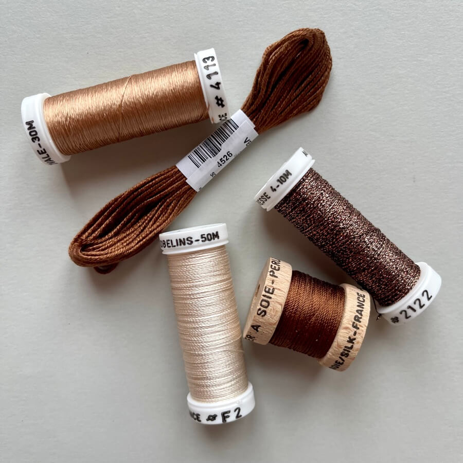 Dieses vorgepackte Probepäckchen von Au Ver à Soie enthält 5 unterschiedliche Seidengarne in einer einzigartigen Farbschattierung. Immer enthalten sind die Garne Soie d'Alger, Soie Perlée und Metallic-Garn. Ergänzt werden diese drei Garne durch zwei der drei Garnqualitäten Soie Ovale, Soie de Paris oder Soie Surfine.
