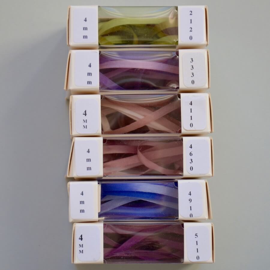 Ruban de Soie sind feine Seidenbänder, die zur Bändchenstickerei verwendet werden. Sie werden in kleinen Boxen geliefert und zwar in einer Länge von 3 Metern. Die Seidenbändchen haben eine Breite von 4 mm oder 7 mm, einige wenige Farben sind auch in einer Breite von 13 mm erhältlich. 12 Farben gibt es auch mit einem zarten Farbverlauf für besondere Effekte.