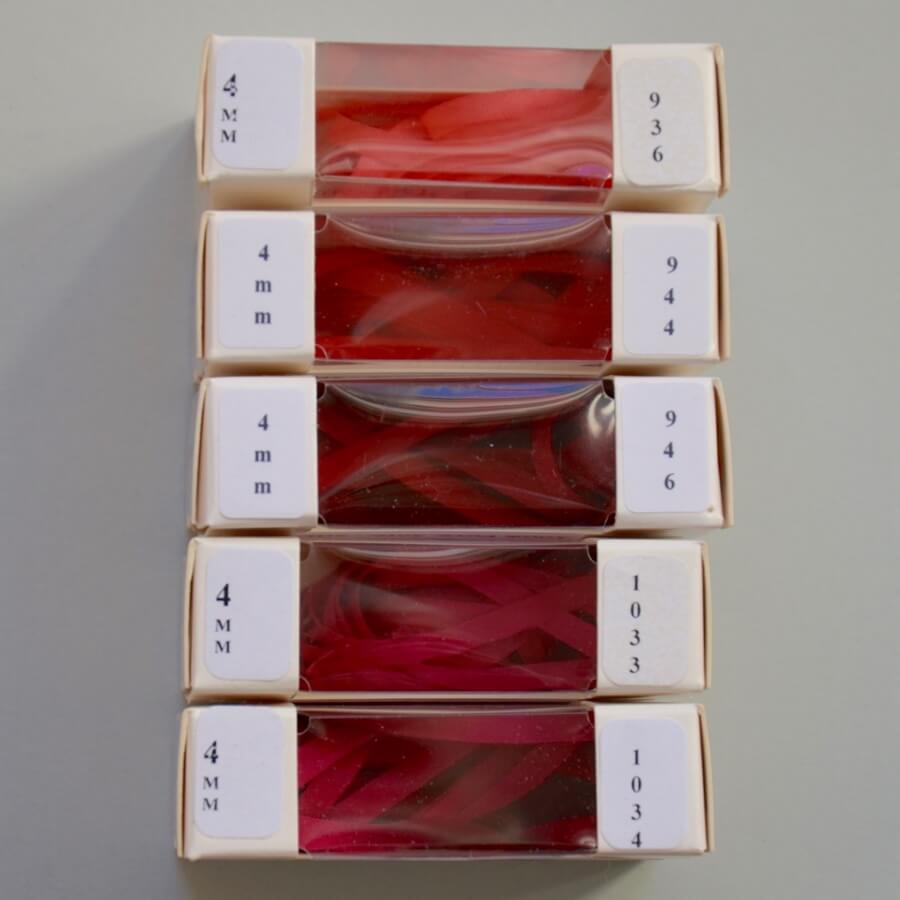 Ruban de Soie sind feine Seidenbänder, die zur Bändchenstickerei verwendet werden. Sie werden in kleinen Boxen geliefert und zwar in einer Länge von 3 Metern. Die Seidenbändchen haben eine Breite von 4mm oder 7mm, einige wenige Farben sind auch in einer Breite von 13 mm erhältlich.