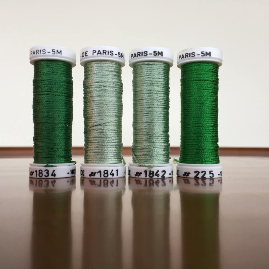 Soie de Paris ist eine hochwertige Filamentseide, deren Fäden nicht gesponnen aber fein verzwirnt sind. Soie de Paris liegt 6fädig und ist teilbar. Auf 14er Leinen stickt man mit einem Faden, so dass man mit einer Spule Soie de Paris 30 Meter laufendes Garn zur Verfügung hat.