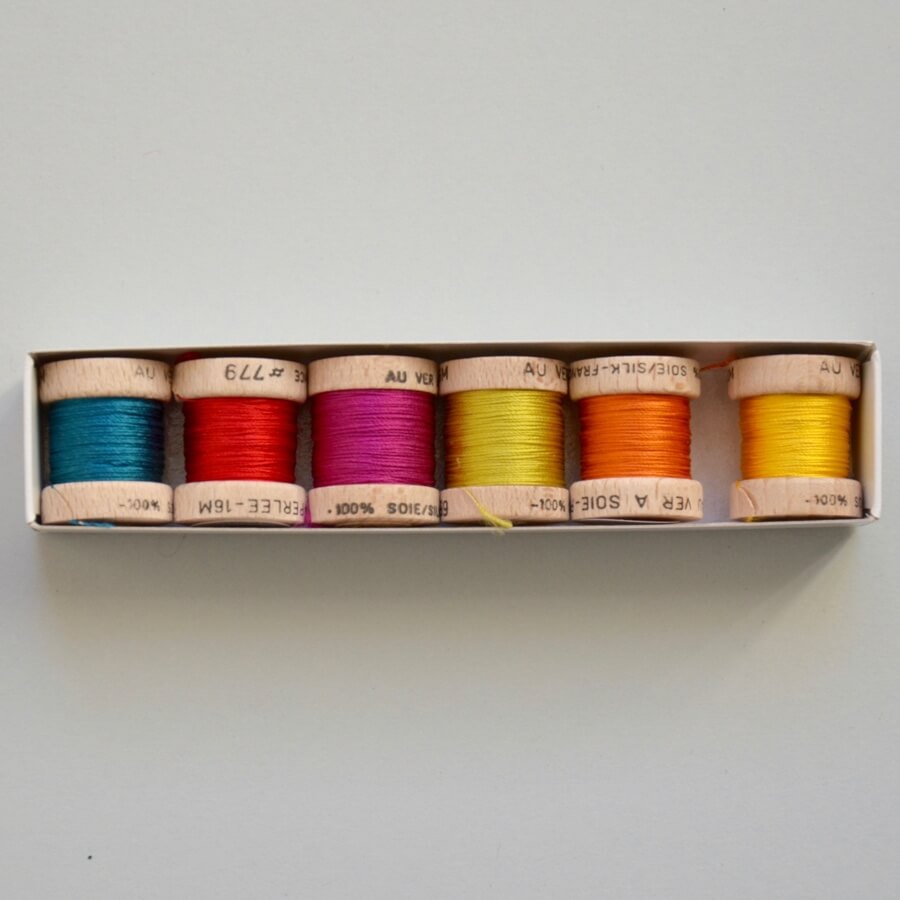 Das Paket Soie Perlèe Glazig enthält 6 Spulen mit je 16m Soie Perlée Garn.