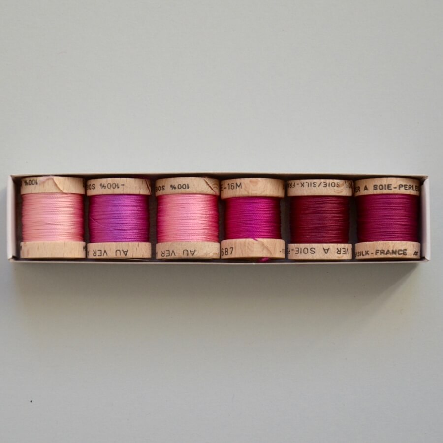 Das Paket Soie Perlée Rose enthält 6 Spulen mit je 16m Soie Perlée Garn.