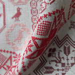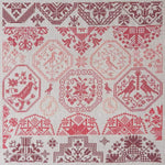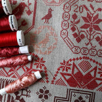 A magical Quaker sampler in shades of red and pink. The charm of this sampler is the lightness of the delicate colors in contrast to the geometric motifs of the Quakers.