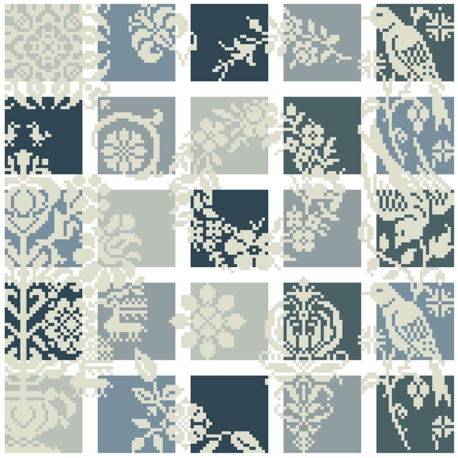 The floral structure of the "Colours of the Air" is reminiscent of a fresh summer's day. The sampler is characterized by the underlying delicate shades of blue. The actual pattern, consisting of baroque blossoms, wreaths and a bird border on the right edge of the sampler, lies like a fine lace over the sky-blue background.