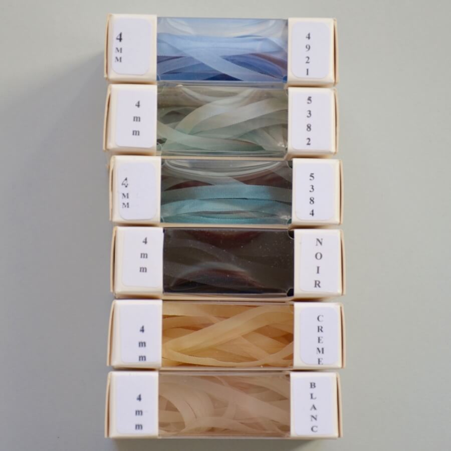 Ruban de Soie are fine silk ribbons used for ribbon embroidery. They are delivered in small boxes, 3 meters long. The silk ribbons have a width of 4 mm or 7 mm, a few colors are also available in a width of 13 mm.