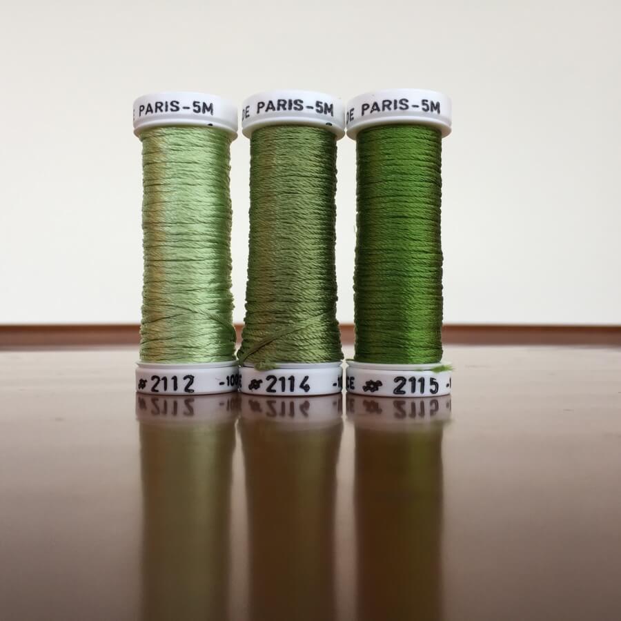 All Soie de Paris silk yarns come on 5 meter spools or in 45 meter spools. Please choose from the following colors from the green color palette: