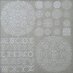 Dieses monochrome grafische Muster lebt von der Spannung zwischen Farbe und unterschiedlicher Struktur der Garne. Hauptsächlich ist dieses Muster gestickt mit Soie d'Alger in crème, einige Akzente werden gesetzt durch das kräftiger und stärker glänzende Soie Perlée. Hier wurden historische Rosettenmotive aus den Vierlande-Tüchern verwendet für ein zeitgenössisches Design.