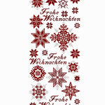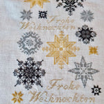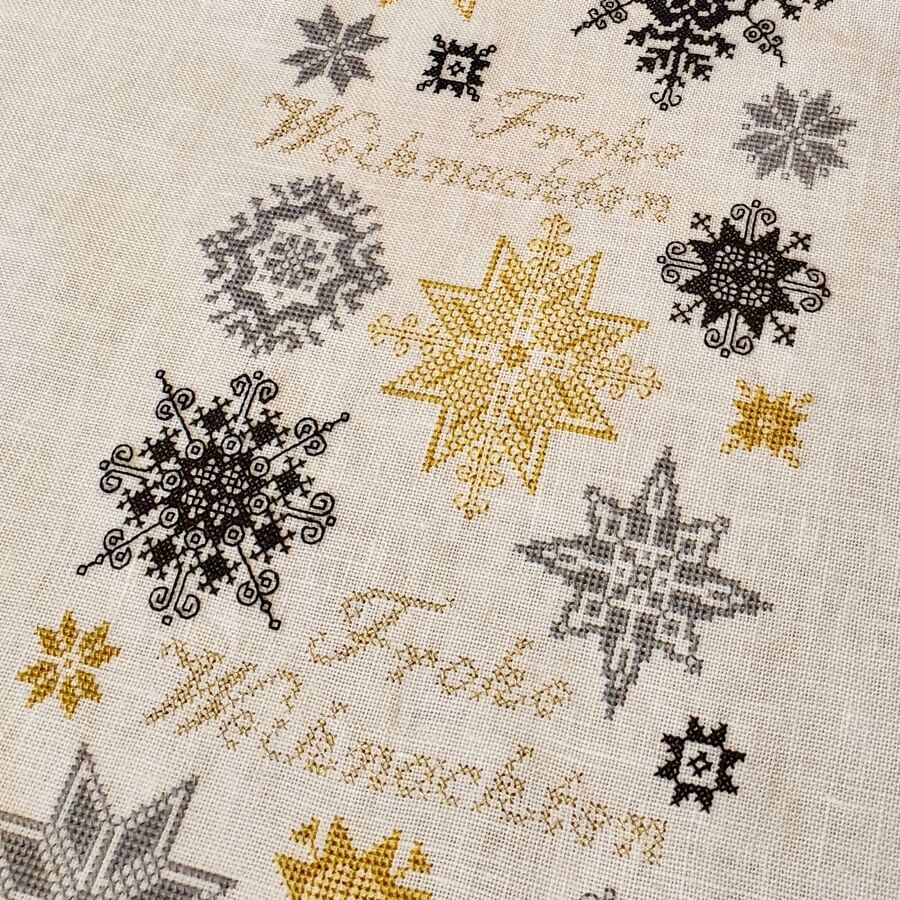 Unser Mustertuch "Fröhliche Weihnachten 1" gibt es nun auch als Tischband. Die feinen Weihnachtssterne ergänzen sich. Schön wirkt es, wenn Mustertuch und Tischband in der Weihnachtszeit gemeinsam zum Einsatz kommen! Wir bieten das Tischband mit 13,5er weißem Leinen oder 15er weißem Leinen an. Wer mag, kann auch auf 13er ungebleichtem Leinen sticken, dann wird die Stickerei allerdings etwas luftig. Das Leinen hat einen Zuschnitt von 50 x 180 cm. Je nach Leinenstärke ist das Tischband zwischen 134 und 120 cm lang und zwischen 15 und 13,30 cm breit. Je feiner das Leinen, desto kleiner das Gestickte! Zusätzlich zu unserer Variante in Rot bieten wir nun auch eine ganz edle Variante in Gold, Grau, Schwarz und dem feinen Metallicgarn Bourdon an. Achtung: die Vorlage ist für die einfarbige Variante. Die Stickerin der goldenen Variante muss während des Stickens entscheiden, in welcher Farbe der Stern jeweils gestickt wird. Ziel ist es, die Farben möglichst schön abzuwechseln. Das Entscheiden von Fall zu Fall, welche Farbe perfekt passt, erhöht den Stickspaß ungemein. Auf unserem Bild ist ein Ausschnitt zu sehen. Wir wünschen Ihnen eine schöne Vorweihnachtszeit!